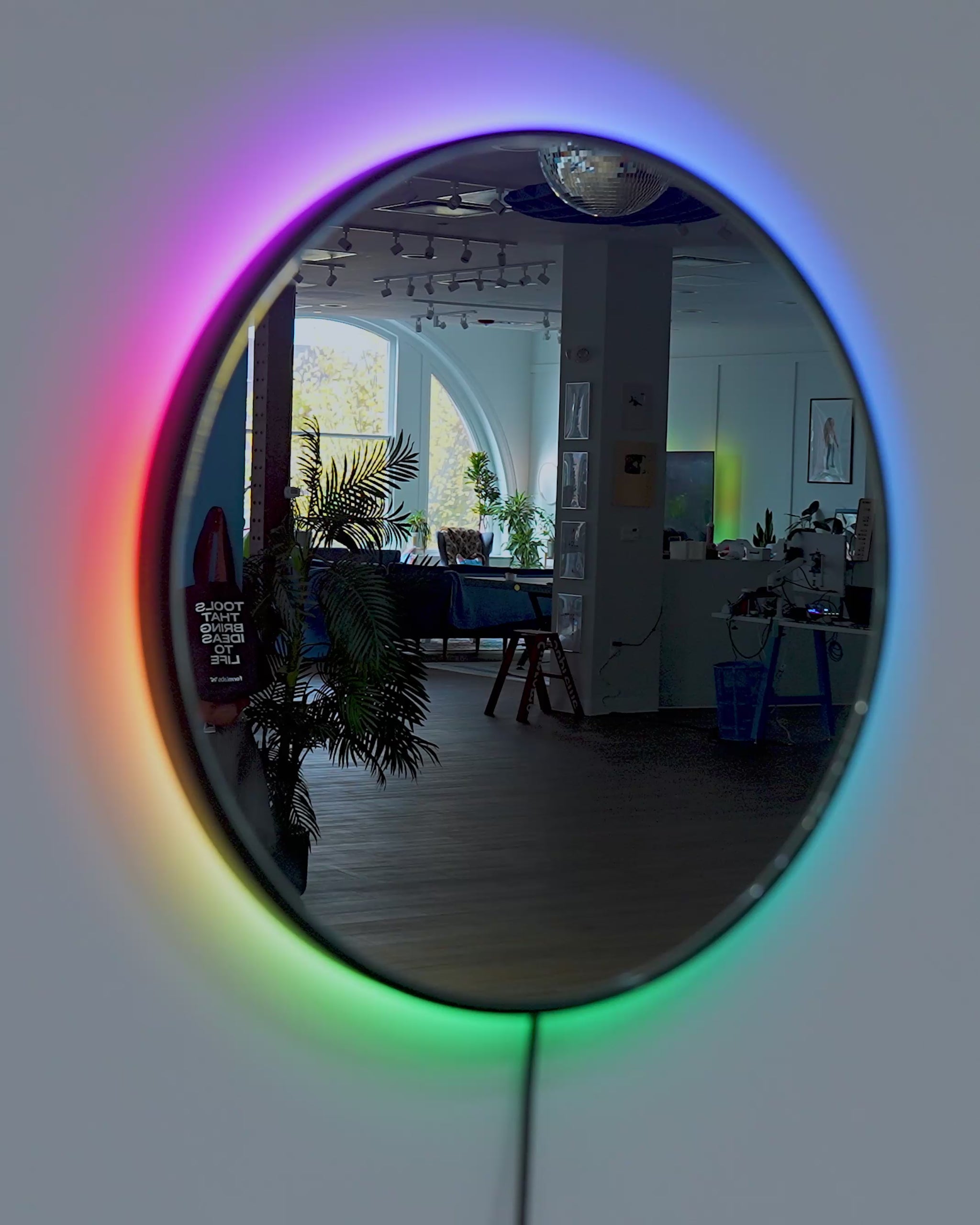 The frame is CNC-milled from solid aluminum, bead-blasted and anodized in a matte black finish. A real glass mirror sits flush inside, surrounded by a custom LED circuit that produces a continuous, smooth loading animation—a clean halo of perpetual motion.